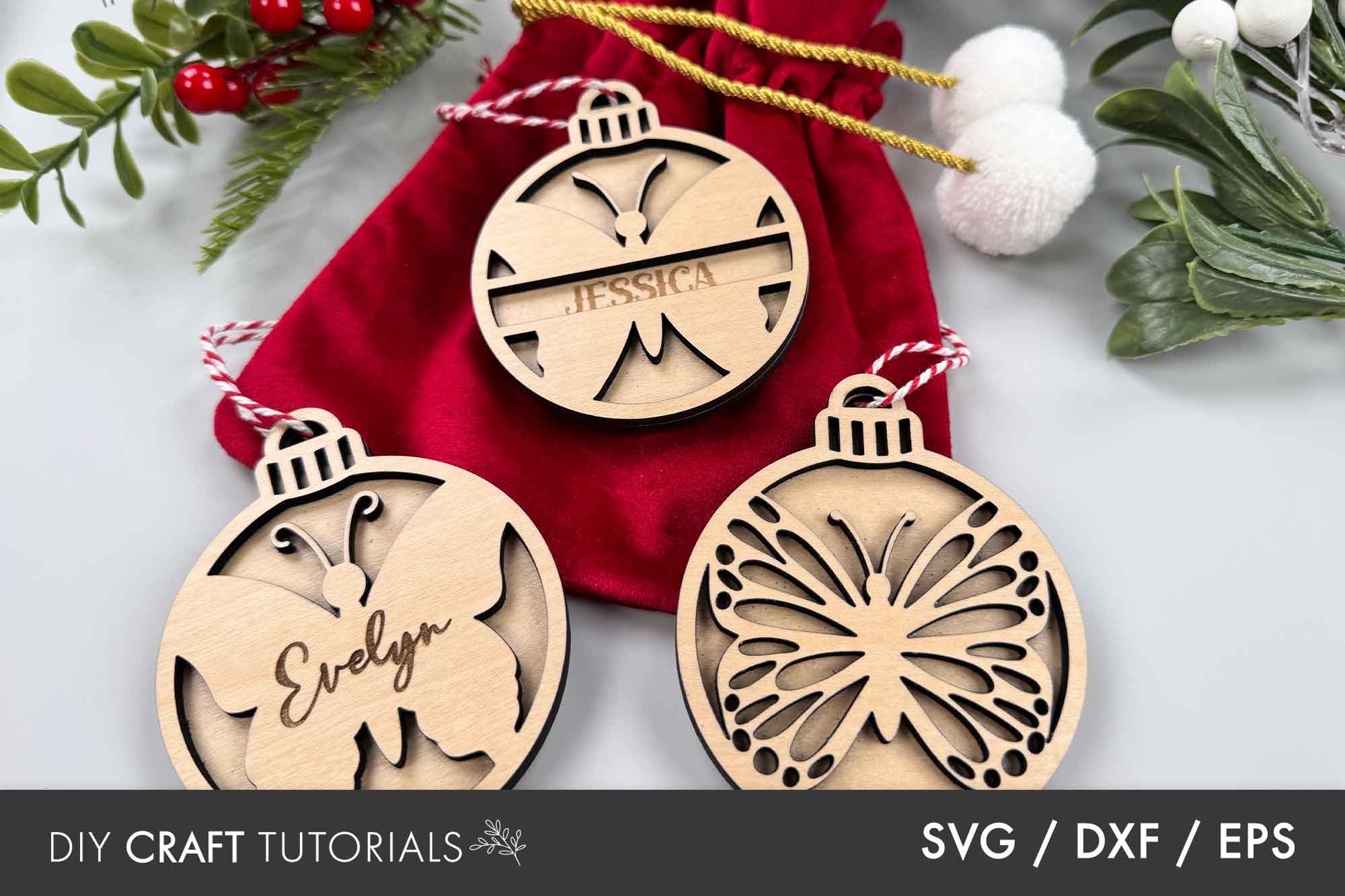 Create stunning personalized butterfly ornaments with this SVG bundle, designed for laser cutting and engraving on wood, acrylic, cardstock, or MDF. Each butterfly ornament SVG is fully customizable with names - perfect for Christmas tree decorations, thoughtful gifts, or craft market products.